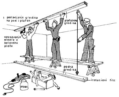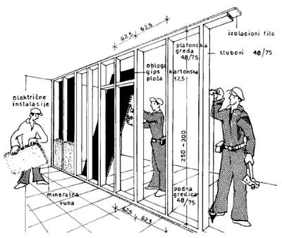 Prvo se postavljaju gredice na pod i plafon lepljenjem ili upucavanjem sa podlogom od filca ili bez njega. Posle se postavljaju vertikalne gredice na osovinskom razmaku 62,5 cm i pričvršćuju se na podne i plafonske gredice ekserima (sl. 4.12). Posle montaže konstrukcije i držača teških predmeta, sa jedne strane se postavljaju gips-kartonske ploče. Pričvršćuju se vijcima i ekserima 2,2/32 mm na razmaku 20 do 25 cm. Posle toga montiraju se kablovi i elektro-instalacije.
