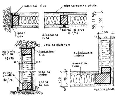 Na sl. 4.15 prikazani su važniji detalji veza unutar zida i sa konstrukcijama na koje on naleže. Detaljni crteži su dati za vezu sa konstruktivnim zidom, povezivanjem gips-kartonskih ploča sa srednjim stupcem, veza sa podom, plafonom i veza na uglu prilikom sučeljavanja dva zida.