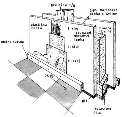Pregradni zid sa drvenom konstrukcijom i oblogom od gips-kartonskih ploča