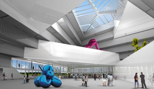 I biblioteka i muzej lepih umetnosti imaju velike atrijume. Dugački sto za učenje se proteže duž unutrašnje ivice biblioteke, a „mostovi za čitanje“ se protežu preko atrijuma povezujuće odeljke i stvarajući zajedničke prostore. Atrijum muzeja lepih umetnosti inkorporira trouglasti centralni prostor koji je pogodan za umetničke instalacije, performanse i sastanke. Muzej takođe poseduje krovnu baštu koja se može koristiti kao bioskop na otvorenom tokom letnjih večeri.