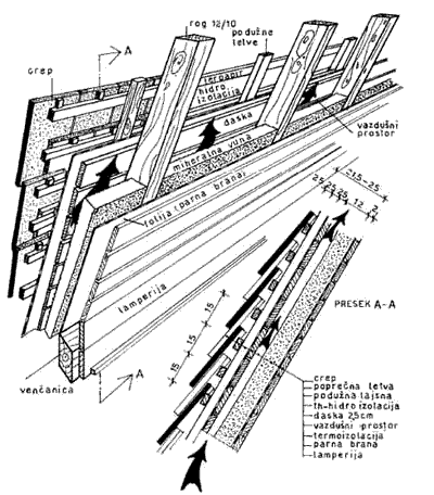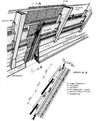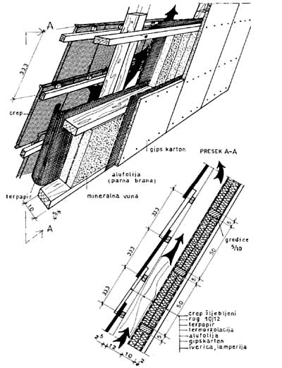 Na sl. 9.2 prikazan je detalj toplotne izolacije sa slojem mineralne vune debljine 10 cm između rogova. Sa unutrašnje strane preko rogova i mineralne vune razapeta je aluminijumska folija, koja ima ulogu parne brane za zaštitu izolacionih slojeva.