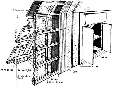 Termoizolacija od mineralne vune pričvršćena je na vertikalne gredice i letve sa spoljne strane pregradnog zida. Druga varijanta na istoj slici pokazuje da se bočni zid može oformiti i u vidu plakara. U tom slučaju termoizolaciju krovne ravni treba izvesti sve do venčanice.
