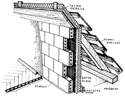 Bočni zid od šupljih blokova za pregrade ozidan je od tavanice do rogova, gde se utapa u krovnu ravan koja ga obezbeđuje od rušenja (sl. 9.6). Mineralna vuna kao termoizolacija postavlja se sa spoljne strane bočnog zida, od koga je odvojena parnom branom. Sa unutrašnje strane zid je omalterisan. Iznad visine zida obrada unutrašnje površine krovne ravni je po izboru, želji i raspoloživom materijalu: lamperija, gips-kartonske ploče, malter itd.
