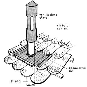 Prodor ventilacione cevi kroz pokrivač obezbeđuje se od prokišnjavanja opšivkom od pocinkovanog lima razvijene širine oko 50 cm, koja je na licu mesta zaletovana za ventilacionu glavu pod uglom nagiba krova, s gornje strane zavučena pod crep, a sa donje postavljena preko crepova. Sa strane su nabori lima (falcevi) radi sprečavanja vode da se sliva sa strane (sl. 9.8).