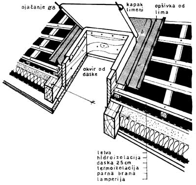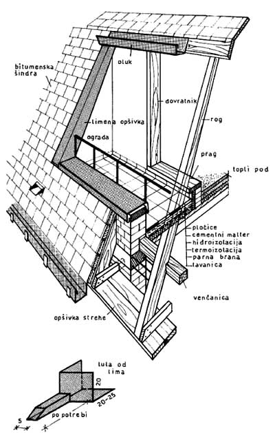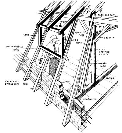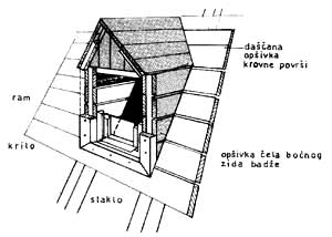 Konstrukcija prikazana na sl. 9.11 pričvršæena je na susedne rogove krova strmog nagiba i sastavljena je od gredica 5/8. U prednju pravougaonu površinu ugrađuje se stojeći prozor standardnih dimenzija ili specijalno pravljen po meri. U trougaone bočne i jednu prednju površinu između gredica ugrađuje se termoizolacija sa parnom branom i dvostranom opšivkom od lamperije. Celu konstrukciju prekrivaju dve trapezne površine u obliku dvovodnog krova. Krovne površine se takođe termički izoluju i pokrivaju istom vrstom pokrivača kojom je zaštićen ceo krov.