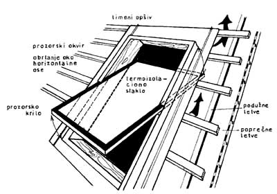 Slična konstrukcija se primenjuje za obezbeđenje ležećeg krovnog prozora (sl. 9.10). Prozori ove vrste su fabričke izrade čiji su detalji rešeni tako da osiguravaju zaptivanje protiv prokišnjavanja i produvavanja. Ugrađuju se u krovne ravni nagiba od 15 do 70°. Krilo i okvir od smrekovine opšiveni su plastificiranim aluminijumskim limom. Zastakljuju se dvoslojnim izolacijskim staklom. Koeficijent toplote provodljivosti K jednak 0 je 2,9 W/m2K i zvučne zaštite od 31 dB. Okov prozora omogućava obrtanje krila oko horizontalne ose za 180°, stabilnost u svakom položaju, pa se staklo može čistiti i sa spoljne strane.