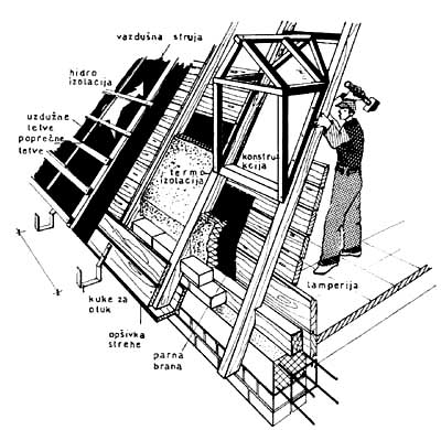 Sl. 9.2 Konstrukcija termo i hidroizolacije potkrovlja sa slojevima toplotne zaštite između rogova