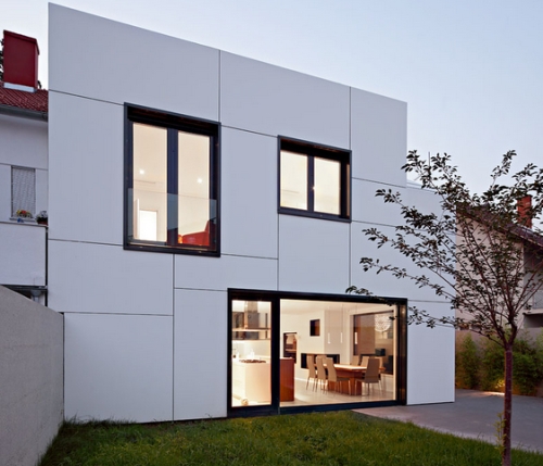 Kuća je istovremeno statična i pokrenuta. Oblikovna nepravilnost osnovne mase, njena solidnost i stamenost ublaženi su nepravilnim ortogonalnim rasterom fasadnih ploča, različitom veličinom i dispozicijom prozora, te igrom odnosa belih i crnih površina (puno-prazno). Igra parova suprotnosti ogleda se i u likovno-estetskom uobličavanju grubosti materijalizacije ogradnog zida i rafinirane glatkoće fasade površine.