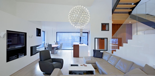 Za razliku od pomalo apstraktne spoljašnjosti, situacija unutar objekta sasvim je drugačija. Težište komunikacije i dinamike prostora čini povezanost tri gradivna elementa: kamina, stepeništa i galerije. Njih okružuju druge namenske prostorije, raščlanjene po sistemu kaskadnih polunivoa, na tragu Raumplana. Ovim principom prostorne organizacije maksimizira se iskorišćenost raspoloživog gabarita, definisanog strogim urbanističkim propisima iz kojih proizilazi i oblikovna rigidnost kuće.