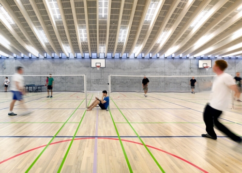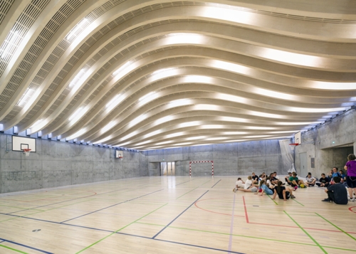 Namesto da zamene postojeće školsko dvorište, arhitekte su odlučile da potope sportsku salu pet metara ispod zemlje i stvore ukrašenu povšrinu preko krova hale. Betonski potporni zidovi okružuju novu halu, gde niz vijugavih drvenih nosača daju krovu njegov lučni oblik.
