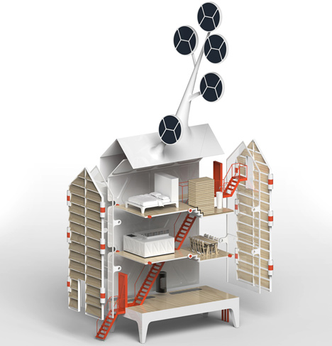 Holandski arhitektonski biro Tjep. razvio je koncept za samodovoljnu kuću sa fasadom koja se otvara kao orman i ima pokretno „solarno drvo“ na krovu. „Većina koncepata malih kuća se zasniva na principu povratka osnovama“, kaže dizajner Frenk Tjepkema, „ali ovaj koncept zaista pokušava da prihvati tehnologiju i integrisani dizajn kako bi se u potpunosti iskoristila samodovoljnost na udaljenoj lokaciji.“