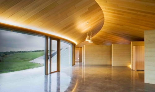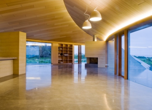 Moderna i jednostavna završna obrada enterija uključuje polirane betonske podove, obloženi plafoni i zidovi od drveta, ogromni dvostruko zastakljeni prozori spratne visine i veliki centralni kamin. Osim toga, oblik, dizajn i korišćeni materijali pružaju kući visoku zaštitu od požara, što je nešto od velikog značaja u australijskim regionalnimm područjima.