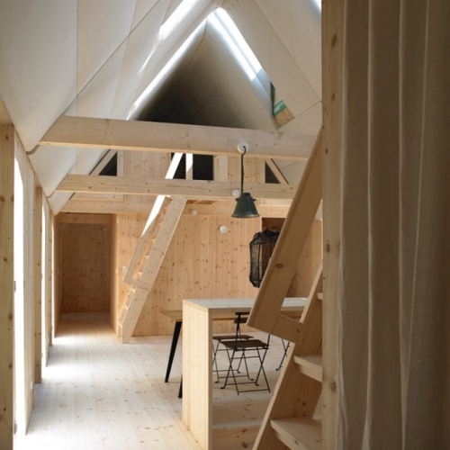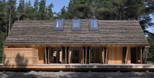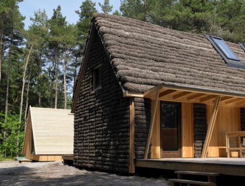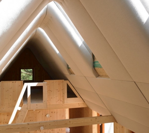 Izgrađena je od drvene konstrukcije i panela i popunjena sa morskim algama kao alternativa mineralnoj vuni. Krov i fasada su zatim obloženi sa jastucima napravljenim od pletene vune i punjeni sa morskom travom. Na krovu su ovi jastuci debeli i meki, dok su na fasadi mali i tvrdi, nalik cigli. Osim toga, kosi plafon je takođe prekriven sa panelima punjeni morskom travom i presvučeni lanenom tkaninom.