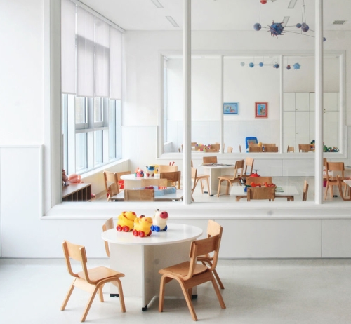 Svedenom arhitekturom obdaništa i definicijom njegove razmere u odnosu na okruženje jasno se naglašava njegov javni karakter i značaj za lokalno susedstvo. Objekat je hromatski pročišćen, a bela boja dominira na fasadi i u obradi enterijera. Obilata primena bele u unutrašnjosti bila je strateška odluka, kako bi se prostori unutar objekta učinili što svetlijim. U takvom ambijentu deca čine dinamični hromatski element, koji postaje sastavni deo arhitekture.