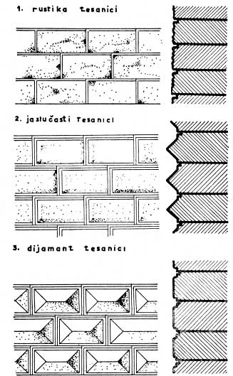 Spoljna površina tesanika može biti različito obrađena: rustika-tesanici imaju grubo obrađenu površinu, a fi no obrađenu obrubu. Dijamant-tesanici imaju površinu obrađenu u obliku piramida. Jastučasti tesanici imaju zaobljene ivice, a ravne površine (sl. 3.198).