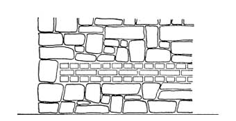 Treba samo napomenuti da se najkrupniji komadi kamena stavljaju na uglove (sl. 3.195). Oko prozora i vrata postavljaju se tesanici ili opeka. Ako je kamen kojim se zida jedre strukture, onda unutrašnje površine zidova treba obložiti opekom. Isto tako, zidovi od opeke mogu se oblagati kamenom. Kamena obloga treba da je najmanje 20cm debela. Kameni blokovi mestimično zadiru u zidnu masu od opeke da bi se ostvarila bolja veza između zida od opeke i kamena (sl. 3.196).