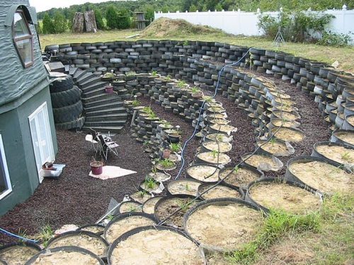 Obiman eksterijer kupole je takođe neverovatno eko-prijateljski. Uz pomoć lokalnog auto servisa, pristupni put i staze su od sitnog gumenog reciklata. Masivana bašta od guma, koja se satoji od četiri nivoa terasa, je napravljena u potpunosti od recikliranih guma iza kupole i smešta povrće i lekovito bilje cele godine. U bašti se takođe gaji limun, limeta, narandža i kumkuat drveće duž strane kupole, okružena ogradom od bambusa.