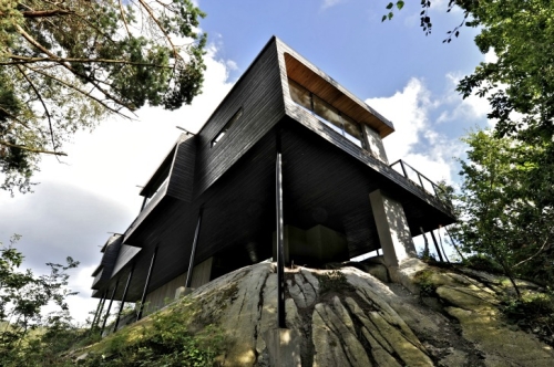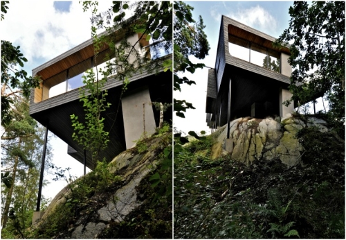 Vilhelmsen je želeo da projektuje kolibu koja se izdiže iznad krošnji i koja bi na taj način evocirala prostornost i mirnoću pejzaža. On je koristio crne i zemljane tonove kako bi dopunio prirodnu sredinu, ujedno stvarajući dramatično sidrište na kamenoj litici korišćenjem čelika koji pridržava podnu konstrukciju. Ova oštra horizontalna ivica je u kontrastu sa vertikalnom linijom betonskog dimnjaka.