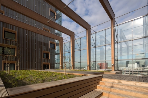 Između dve stambene kule (jedna broji 13, a druga 16 spratova) nalazi se zajednička krovna bašta na sedmom spratu (fotografija iznad). Zgrada je pokrivena sa „kabanicom“ od stakla, koja na sebi ima print nalik zavesi, dok su fasade iza staklenih zidova obložene sa borovinom. Otvori u zavesi, iza kojih se nalaze lođe, deluju kao da su zaobljeni, ali to je samo optički efekat stvoren od strane specifičnog oblika elemenata za pričvršćavanje koji drže staklene panele.