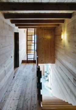 Prizemljom kuće dominiraju stepenice koje vode na prvi sprat gde se nalazi mala spavaća soba, kupatilo i druga, veća spavaća soba koja je zapravo deo starog objekta. Skladišteni prostor se nalazi iznad stepenišnog prostora u potkrovlju, a njemu se pristupa merdevinama. U prizemlju se, takođe, nalazi deo za sedenje.