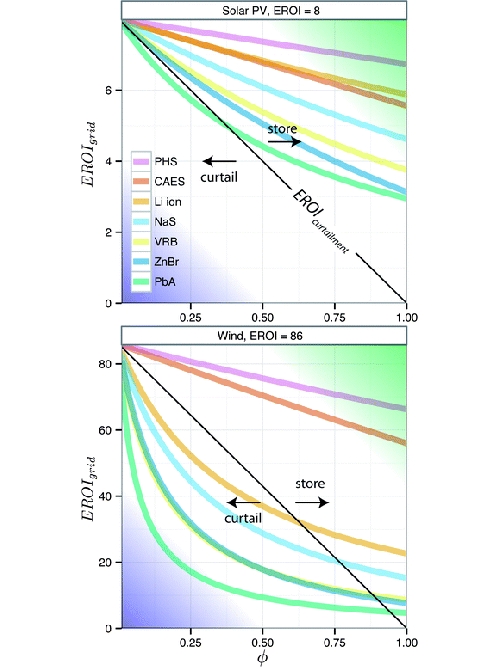 Iako odbacivanja proizvedene energije rezultira u neposrednom gubitku energije, izbegavanje tog gubitka kroz energetsko skladištenje takođe zahteva ulaganje energije, bilo kroz proizvodnju baterija ili izgradnju infrastrukture. Međutim, nije svako skladištenje isto, niti su energetski zahtevi stvaranja vetroparkova i solarnih parkova ekvivalentni. Izražavanjem sve energije na ekvivalentan način, tim može uporediti povraćaj energije dobijen iz solarnih i vetro izvora sa energijom skladištenom u baterijama, po jedinici energije potrebno da se izgradi bilo šta od ovoga (izraženo kao EROI za povraćaj energije i ESOI za skladištenje energije).