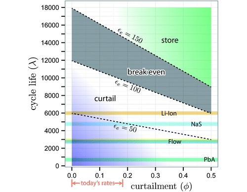 U grafikonu ispod, možete da pročitate φ u donjoj osi koja predstavlja ovaj delić. Na krajnjoj desnoj strani, ako se 100% energije odbacuje ili skladišti, onda je skladištenje samo za malo bolja opcija sa bilo kojim tipom energije. Ali u drugim stopama to zavisi od tipa baterije.
