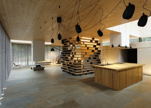 Drvene stepenice koje vode ka gornjem spratu predstavljaju dodatni ukras prizemlja jer su uokvirene prozirnom drvenom kutijom nalik naslaganim paletama. „Glavni problem kod izrade stepenica je bili naći mašinu sposobnu za sečenje tako velikih komada drveta“, kaže arhitekta Arno Lakost (Arnaud Lacoste). „Kada smo to pronašli, montaža je bila kao ogromna slagalica.“