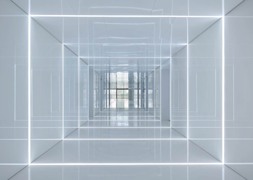 „Ovakav pristup gde se koristilo samo staklo omogućava kompleksnost koja nastaje iz prostog izvora“, dodaju arhitekte. Ulaz u kancelarije je preko hodnika skroz obojenog u belo, gde su linije svetlosti reflektovane tako da stvore iluziju beskrajne mreže.