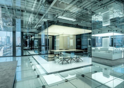 Ventilacioni kanali i druge instalacione cevi su vidljive kroz kontinuirani stakleni plafon, dok stakleni podovi okružuju pojedinačne sale za sastanke. Particije sa ogledalima se smenjuju sa prozorima, dajući kontrast vizurama između pojedinačnih prostorija i uokvirenim panoramama Šangaja.