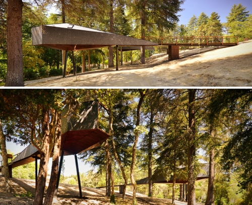 Ime sami kuća na drveću ukazuje odakle su njihove formalne reference izvedene. Protežući se iznad nagnutog terena parka, kućama se pristupa preko otvorenog mosta koji se postepeno širi prema ulazu u konzolnu unutrašnjost kuće, koja je u obliku glave zmije.