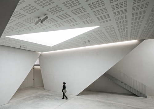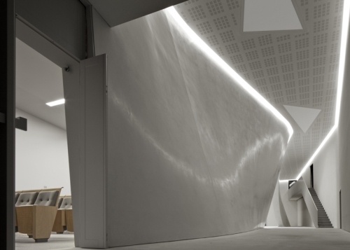 Zakrivljeni betonski zidovi odvajaju auditorijum kapaciteta 220 mesta od recepcije, garderobe i magacinskog prostora, pružajući prazno platno na kome se mogu kačiti umetnička dela ili projektovati filmovi.