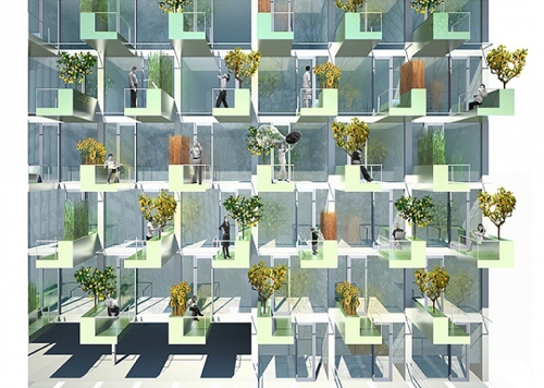 Svaki sprat vodi do zajedničkog staklenika u kome se može gajiti sveže povrće i voće tokom cele godine. Pored proizvodnje hrane, vertikalni staklenik služi i kao termalni dimnjak, pružajući prirodnu poprečnu ventilaciju u celoj zgradi.
