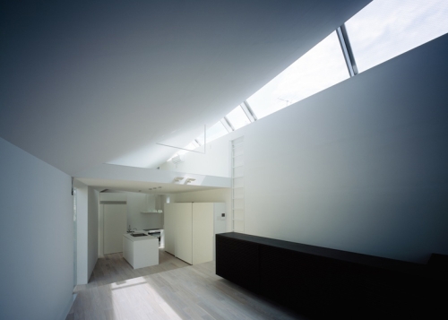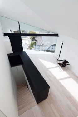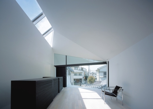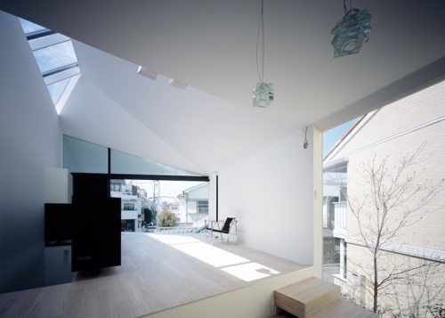 „Neblokirani pogled na nebo koje se pruža kroz svetlarnik pruža takav efekat da stanari zaborave da se nalaze u kući koja je smeštena u gusto naseljenoj stambenoj zoni“, objašnjavaju arhitetke. Stepenište pod blagim nagibom protežu se duž zida koji je pod uglom i predstavljaju glavni ulaz u kuću.