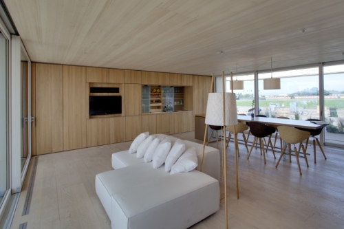 TimberSil, vatrostalni drveni proizvod sa injektiranim staklom je korišćen sa oblaganje elemenata koji okružuju kuću. Unutrašnji detalji kao prozori iznad nivoa očiju na prednjem zidu i prozori različitih veličina i visina, stvaraju ovaj više nego dinamičan enterijer. Malom hodniku je dat spušten plafon kako bi se naglasili veći prostori kuhinje/trpezarije i spavaće sobe na oba kraja.