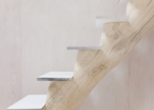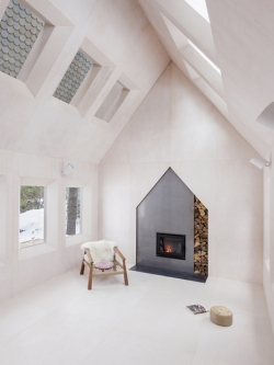Dnevna soba zauzima centralni pravougaoni prostor, dok trpezarija formira vezu sa postojećim objektom. Stepenište naprvljeno od jednog stabla vodi do tavana na prvom spratu, gde zidovi prate strim ugao krova. Zaobljena drvena šindra ukrašava jednu unutrašnju stranu krova i vidljiva je iz dnevne sobe kroz niz unutrašnjih prozora.