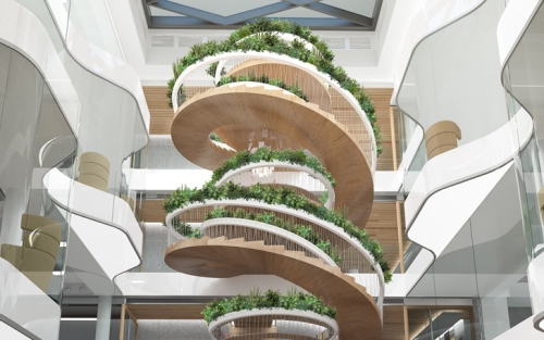 Spiralni dizajn je širi od standardnog stepeništa, sa namerom da više prostora deluje atraktivno zaposlenima kako bi provodili više vremena okruženi biljkama. Spiralne stepenice se otvaraju u tri kružne drvene platforme koje su okružene sa zaobljenim klupama. Ovi podesti mogu da funkcionišu kao socijalna mesta, improvizovana mesta za sastanke, ili mesto gde zaposleni mogu da obeduju tokom pauze.
