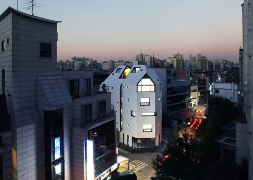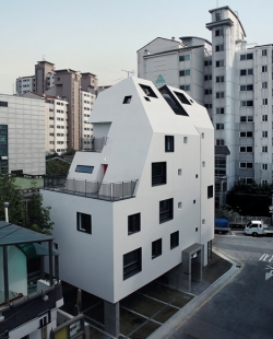 Južnokorejski arhitektonski biro Design Band YOAP smestio je devet stanova i prodavnicu unutar ovog kompaktnog belog stambenog bloka u Seulu. Lokacija nove zgrade je ograničena na veoma mali prostor, čak i za kuću: osam metara širine sa 20 metara dužine, sa 175 kvadartnih metara prostora. Devet stanova je moralo biti upakovano u ovoj petospratnoj multipleks stambenoj zgradi.