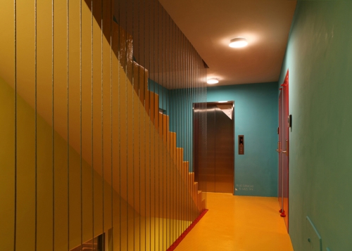 U suprotnosti sa blistavo belom fasadom zgrade, unutrašnji šareni prostori se otvaraju posetiocu prolaskom kroz crvena ulazna vrata. Šetajući se od ulaza u zgradu do vrata svakog stana, posetioci mogu pronaći neočekivane prostore i scene koje se pojavljuju u svakom ćošku. Žute stepenice se presecaju sa svetlo plavim i žutim zidovima. Svaki put kada se otvore crvena vrata, ljudi se suočavaju sa šarenilom slika.