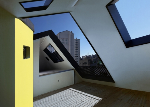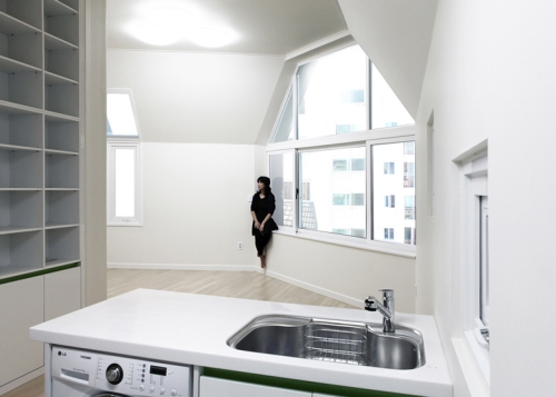 Jednom kada stanari ušetaju u svoje stanove kroz crvena vrata, veliki prozori su tu da ih dočekaju sa pogledima na male ulice Seula. Projektanti su maksimalno iskoristili skučenu lokaciju, od kojih tri strane gledaju ka ulice, pozicioniranjem prozora ka ulici, a ne susednoj zgradi, kako bi stvorili nesmetane vizure.