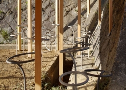 „Prostorno iskustvo paviljona ima za cilj da podseti posetioce na šetnju u planinama pod debelim zaklonom od drveća“, rekli su iz dizajn studija Nendo. Zakrivljene čelične cevi su korišćene kako bi se napravio niz stolica unutar i van skloništa, i one su dizajnirane u različitim veličinama i oblicima kako bi oponašali način na koji gljive rastu u divljini. „