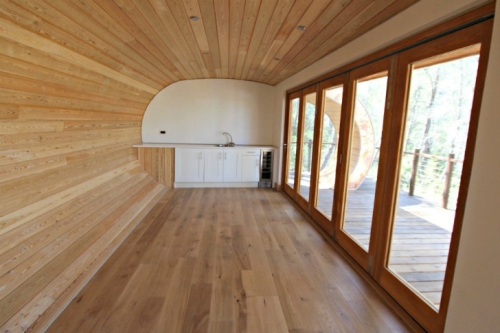 Sklapajuća taklena vrata ispunjavaju kompaktan prostor sa svetlošću i stvaraju neposrednu vezu sa šumom. Unutrašnjost je opremljena sa svetlim i modernim finišom zajedno sa čajnom kuhinjom sa mini frižiderom. Kućica na drvetu ima dovoljno prostora za krevet i stolice, ili može da se koristi kao studio.