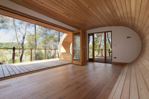 Na kraju staza nalazi se veći trem sa pogledom na šumu i baštu, kao i put koji vodi nazad do vile klijenta. Spiralno utočište je izgrađeno sa održivo posečenim drvetom, a laminirana rebra su korišćena za ram. Završni materijali uključuju panele od ariša, ručno rađeni detalji od bakra i od konopaca.