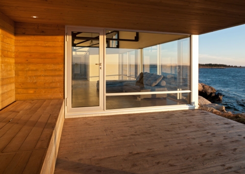 Opremanje enterijera je namerno ostavljeno minimalno kako se ne bi skretala pažnja sa pejzaža. „Kada sedite ispred ognjišta u kući, zemlja između kuće i ivica vode nestaju iz vidokruga, a ravan poliranog sivog betonskog poda se proteže ka stalno menjajućoj površini okeana“, pomalo idilično opisuju arhitekte.