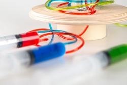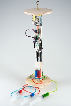 Špricevi obešeni ispod lampe su povezani na drugi skup unutar tela lampe korišćenjem čistih cevčica, kako bi se videlo kretanje mastila od špriceva ka lampi. Krajevi ovih špriceva unutar lampe su povezani sa kliznim prekidačima koji su povezani sa Arduino mikroprocesorom koji kontroliše izlaznu boju RGB LED prestenova lampe.