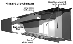 Projektni biro Teng&Associates iz Čikaga, dovršio je u potpunosti novu tehnologiju gradnje prednapregnutim gredama obloženim FRP-om koje su omogućile da primena ovog polimera konačno počne. Sistem se zasniva na hibrid-kompozitnim gredama tj. HCB (Hybrid-Composite Beams), a njihove osnovne prednosti su: