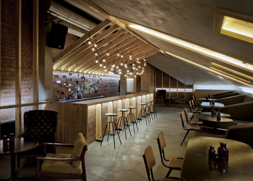 „Kada smo počeli da projektujemo ovaj bar naš cilj je bio da stvorimo prostor koji ima jedinstvenu atmosferu gde se staro i novo mešaju zajedno na savršeni način“, kaže arhitekta Dmitrij Kudin. Polovni nameštaj okružuje bar, i on potiče sa raznih mesta, uključujući i staru školu u Irskoj i buvljake u Švedskoj.