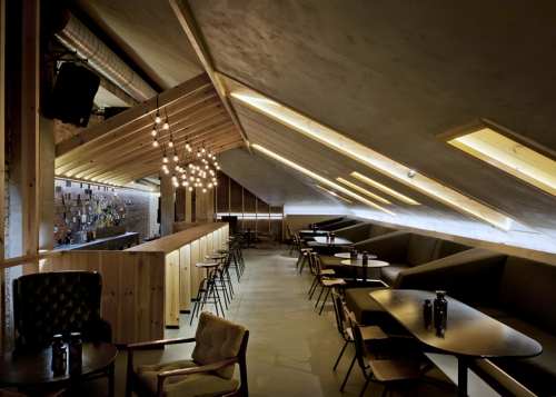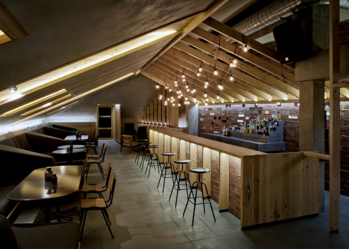 Litvanski arhitektonski biro Inblum Architects je angažovan da projektuje bar na poslednjem spratu stare kuće u Minsku, Belorusija. Ova zgrada je obnovljena nakon oštećenja nastalih u Drugom svetskom ratu i u njoj se sada nalazi kancelarijski prostor na dva sprata, dok je tavanski prostor preprojektovan tako da smešta bar pod krovom koji spaja tradicionalni karakter kuće sa savremenim tokovima.