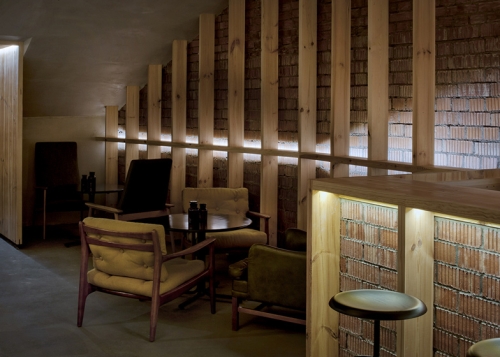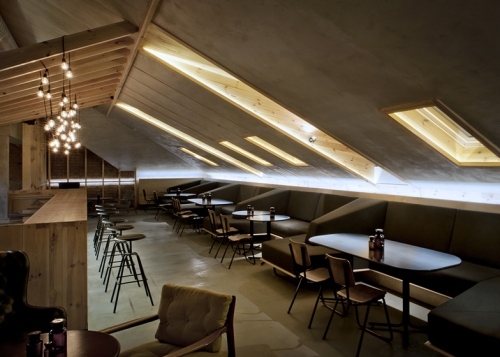 Arhitekte su ostavili zidove od cigli izloženim i koristili su isti tip cigle da izgrade bar koji se proteže duž jedne strane tavanskog prostora. Drveni ram je smešten oko bara i produžava se duž zidova, služeći kao police i stalak za odlaganje kaputa. On takođe stvara nadstrešnicu iznad samog bara koji podseća na niz krovnih rogova, što smanjuje visinu plafona na toj strani i daje prostoru intimniju atmosferu.