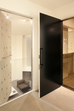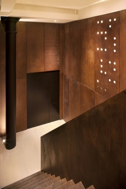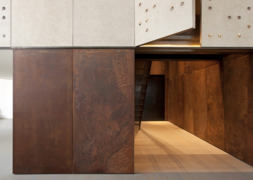 Ulazni foaje duple spratne visine je obložen čeličnim pločama koje su hemijskim procesom tretirane tako da delu zastarele sa zrnastim izgledom. „Sirovi izgled i prirodna paleta boja materijala dodatno izražava formalnu logiku i, pozivajući se na ukus vlasnika za ruskom političkom umetnošću, stvara dramatičnu pozadinu“, rekao je Godfri.