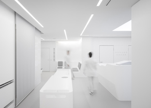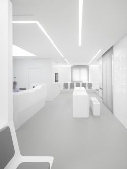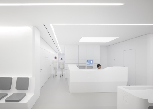 Arhitekte su započele svoje renoviranje instaliranjem velikog volumena Corian-a koji obavija nekoliko prostorija unutar klinike i smešta različite funkcije i aktivnosti. On integriše informacione ekrane i čiviluke koji se izvlače u prijemnom delu, a takođe se krivi nadole na jednoj strani kako bi pružio mesta za sedenje pacijenata i za skladištenje magazina.